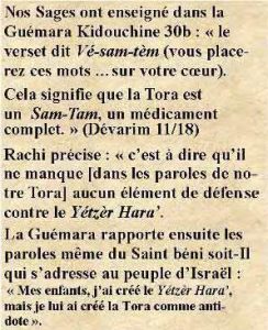 Nous apprenons ainsi comment combattre le Yétzèr Hara’ au moyen de la Tora. Si on y place toute son ambition, le Yétzèr Hara’ ne peut pénétrer en nous. Naturellement il faut éviter la moindre fissure par laquelle il pourrait se faufiler.