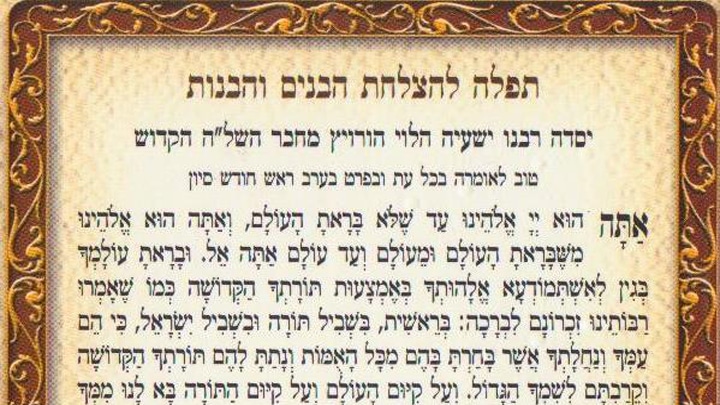 אָבִינוּ אָב הָרַחֲמָן, תֵּן לְכֻלָּנוּ חַיִּים אֲרוּכִים וּבְרוּכִים, מִי כָמוֹךָ אַב הָרַחֲמִים זוֹכֵר יְצוּרָיו לְחַיִּים בְּרַחֲמִים, זָכְרֵנוּ לְחַיִּים נִצְחִיִּים, כְּמוֹ שֶׁהִתְפַּלֵּל אַבְרָהָם אָבִינוּ לוּ יִחְיֶה לְפָנֶיךָ, וּפֵרְשׁוּ רַבּוֹתֵינוּ זִכְרוֹנָם לִבְרָכָה, בְּיִרְאָתֶךָ. כִּי עַל כֵּן בָּאתִי לְבַקֵּשׁ וּלְחַנֵּן מִלְּפָנֶיךָ שֶׁיְּהֵא זַרְעִי וְזֶרַע זַרְעִי עַד עוֹלָם זֶרַע כָּשֵׁר, וְאַל יִמָּצֵא בִי וּבְזַרְעִי וּבְזֶרַע זַרְעִי עַד עוֹלָם שׁוּם פְּסוּל וָשֶׁמֶץ, אַךְ שָׁלוֹם וֶאֱמֶת וְטוֹב וְיָשָׁר בְּעֵינֵי אֱלֹהִים וּבְעֵינֵי אָדָם, וְיִהְיוּ בַּעֲלֵי תוֹרָה, מָארֵי מִקְרָא, מָארֵי מִשְׁנָה, מָארֵי תַלְמוּד, מָארֵי רָזָא, מָארֵי מִצְוָה, מָארֵי גוֹמְלֵי חֲסָדִים, מָארֵי מִדּוֹת תְּרוּמִיּוֹת, וְיַעַבְדּוּךָ בְּאַהֲבָה וּבְיִרְאָה פְּנִימִית, לֹא יִרְאָה חִיצוֹנִית, וְתֵן לְכָל גְּוִיָּה וּגְוִיָּה מֵהֶם דֵּי מַחְסוֹרָה בְּכָבוֹד, וְתֵן לָהֶם בְּרִיאוּת וְכָבוֹד וָכֹחַ, וְתֵן לָהֶם קוֹמָה וְיֹפִי וְחֵן וָחֶסֶד, וְיִהְיֶה אַהֲבָה וְאַחֲוָה וְשָׁלוֹם בֵּינֵיהֶם, וְתַזְמִין לָהֶם זִוּוּגִים הֲגוּנִים מִזֶּרַע תַּלְמִידֵי חֲכָמִים מִזֶּרַע צַדִּיקִים, וְגַם זִוּוּגָם יִהְיוּ כְּמוֹתָם כְּכָל אֲשֶׁר הִתְפַּלַּלְתִּי עֲלֵיהֶם, כִּי זִכָּרוֹן אֶחָד עוֹלֶה לְכָאן וּלְכָאן